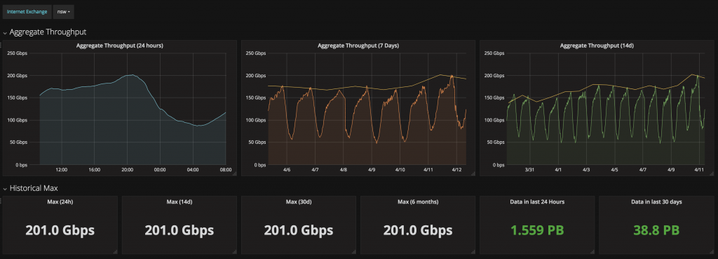 The team at IX Australia are pleased to announce that on the evening of 12th of April we hit a milestone traffic volume of 201Gbit/sec. The last 14 months have seen the fabric double it’s throughput having only hit 100Gbit/sec for the first time on 16th Feb 2017, only 419 days prior.