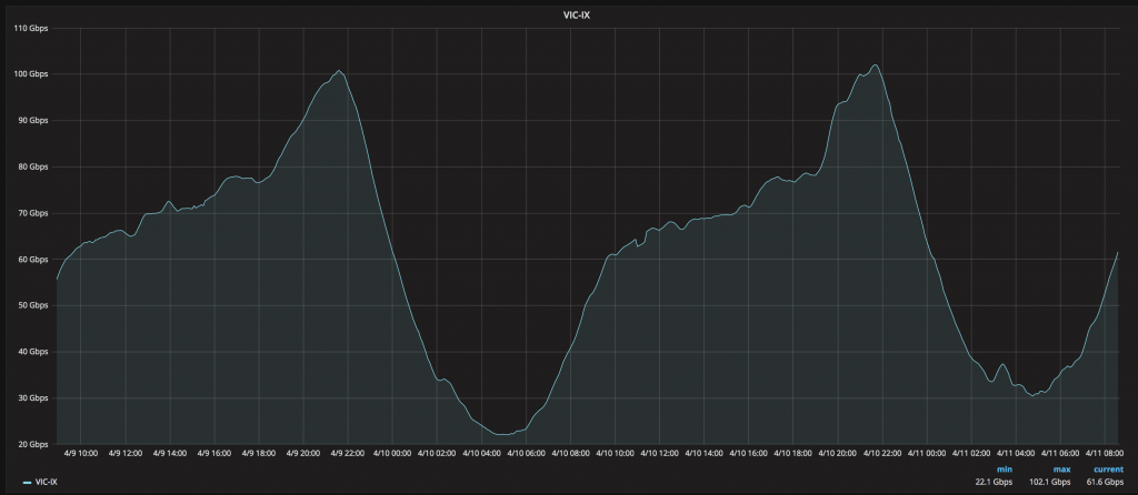 We are pleased to announce that at around 21:30 AEST VIC-IX hit 102.1 Gbit/sec total aggregate throughput. This is a major milestone for VIC-IX having shown tremendous growth over the past 12 months. We have seen a huge change in the uptake in peers and content providers on the fabric providing more value to our members. We’re excited to see what the next 12 months will bring.